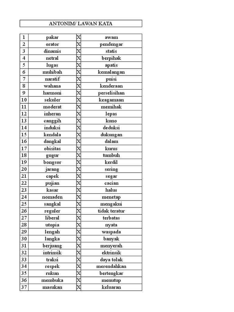 Dengan demikian antonim dapat diartikan sebagai kata yang mengandung makna keterbalikan atau berlawanan dengan kata lain. Antonim berasal dari kata Ant yang berarti lawan dan Onim yang berarti kata. Berikut ini adalah daftar lengkap antonim pakar menurut Tesaurus Bahasa Indonesia.