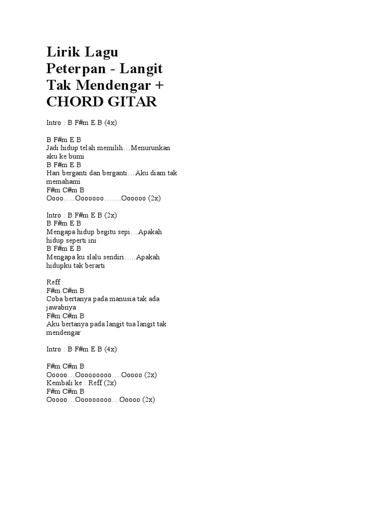 Chord Gitar dan Lirik Lagu Menghapus Jejakmu - Peterpan. Berikut cuplikan syair nyanyian teks dari lagunya. Ku tlah biasa tuk sementara Walau aa.