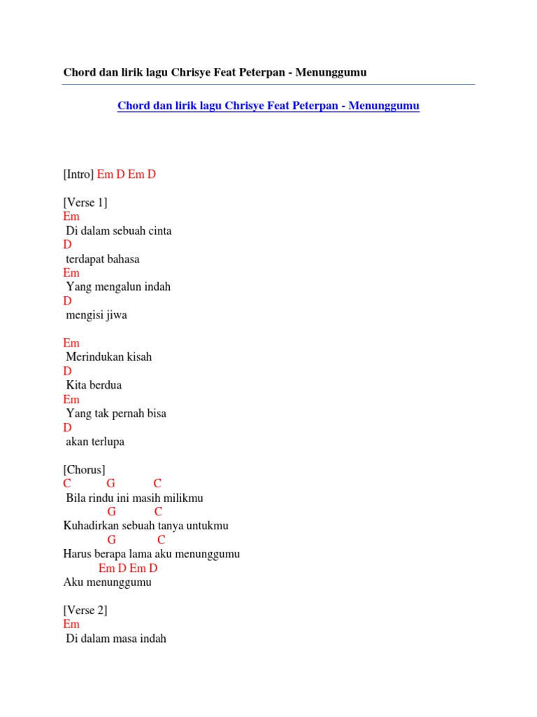 Chord Dan Lirik Lagu Chrisye Feat Peterpan Menunggumu